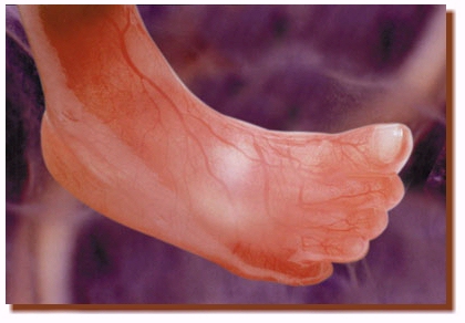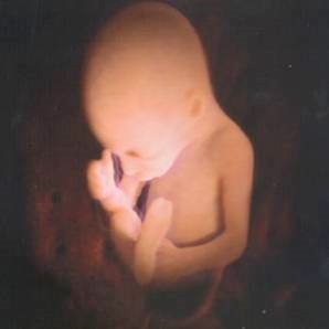 Detalhes das mãos de um feto quando a gravidez completa um mês e meio, isto é, quando o atraso mentrual é de um mês, já que a gestação se inicia sempre quinze dias antes do primeiro atraso menstrual. Nessa foto exatamente 7 semanas de gravidez.